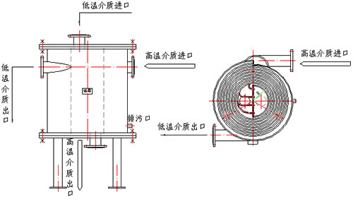 ○2可拆式Ⅱ型 可拆式Ⅱ型換熱器管內(nèi)通道為閉式,介質(zhì)螺旋狀運(yùn)行,管外通道介質(zhì)上下直通運(yùn)行,主要適用于無(wú)壓力或兩個(gè)通道壓差大的場(chǎng)合,管內(nèi)通道走壓力大、腐蝕嚴(yán)重者。這樣可節(jié)省材料且布局更趨合理性。